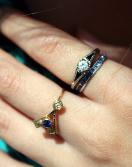 The ring is an antique quarter carat diamond ring with two triangle shaped sapphires. The prettiest part of the ring is the filigree work done in the setting. The ring is from an old watch shop in upstate New York that had a small selection of antique rings. At the time I had no extra money whatsoever, but I knew they bought "old gold jewelry." I loved the ring so much that I asked if they would accept a trade. I had an old diamond cluster ring from the 80s that I didn't like anymore and it always seemed to have loose stones. I got a $200 trade-in price for my old ring, and gladly put the antique diamond ring on layaway. I paid the difference in price over time.